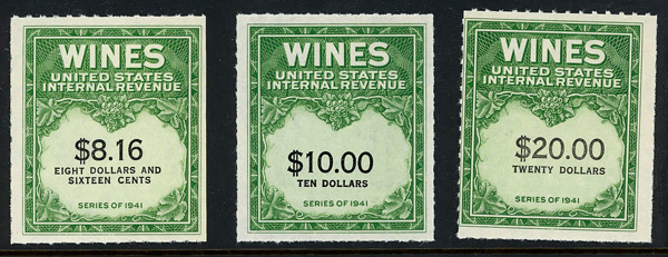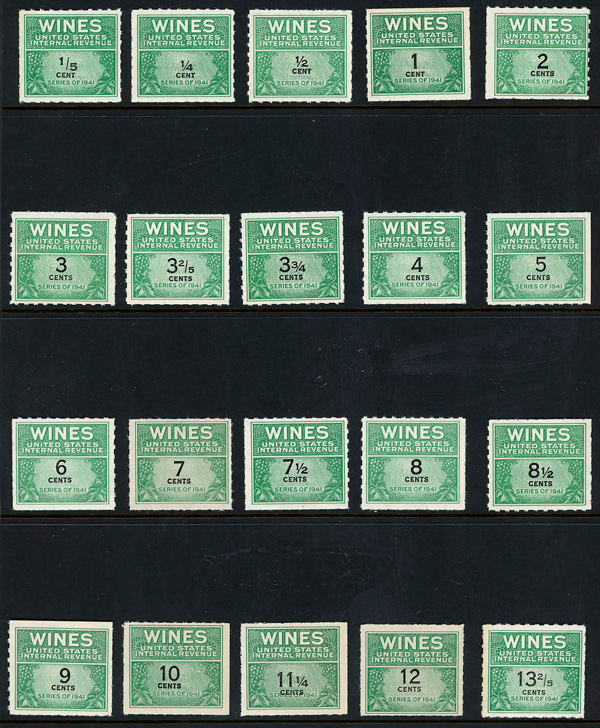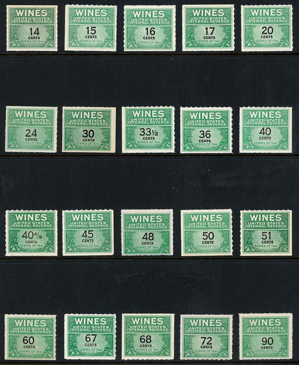 8421 ng RE108//RE203 imageWine Stamps, 1942-54, 1/5¢-$20.00 (Scott RE108//RE203), selection of 59 different, without gum as issued, Fine to Very Fine.