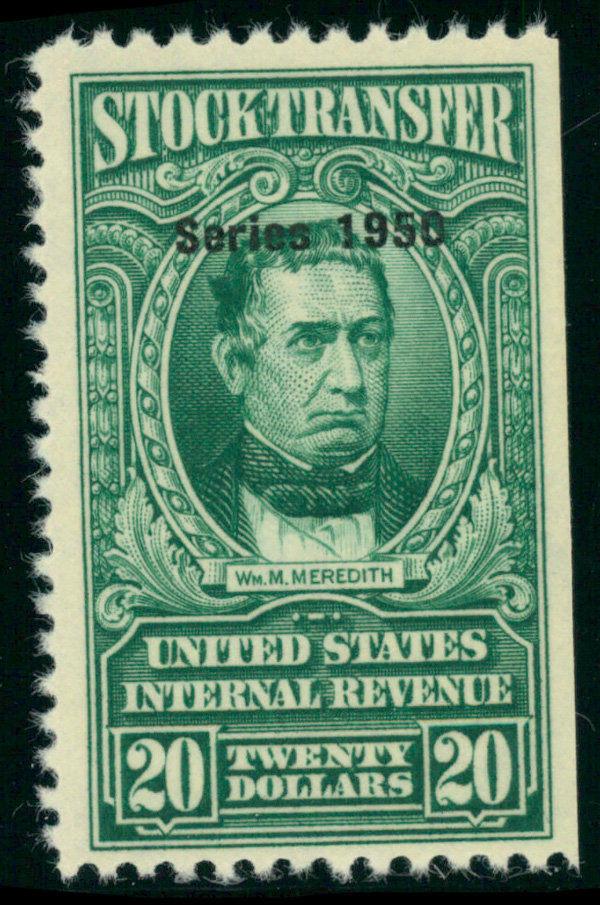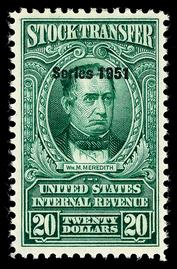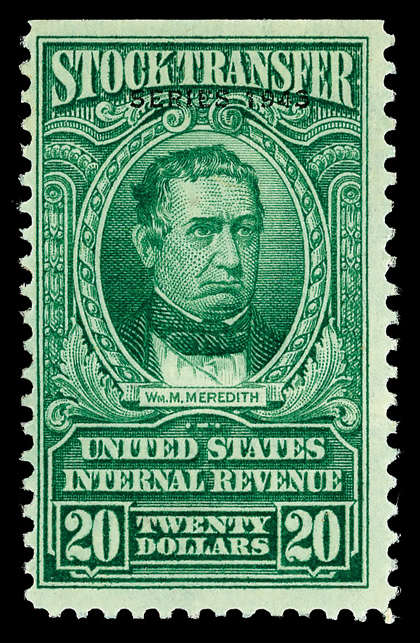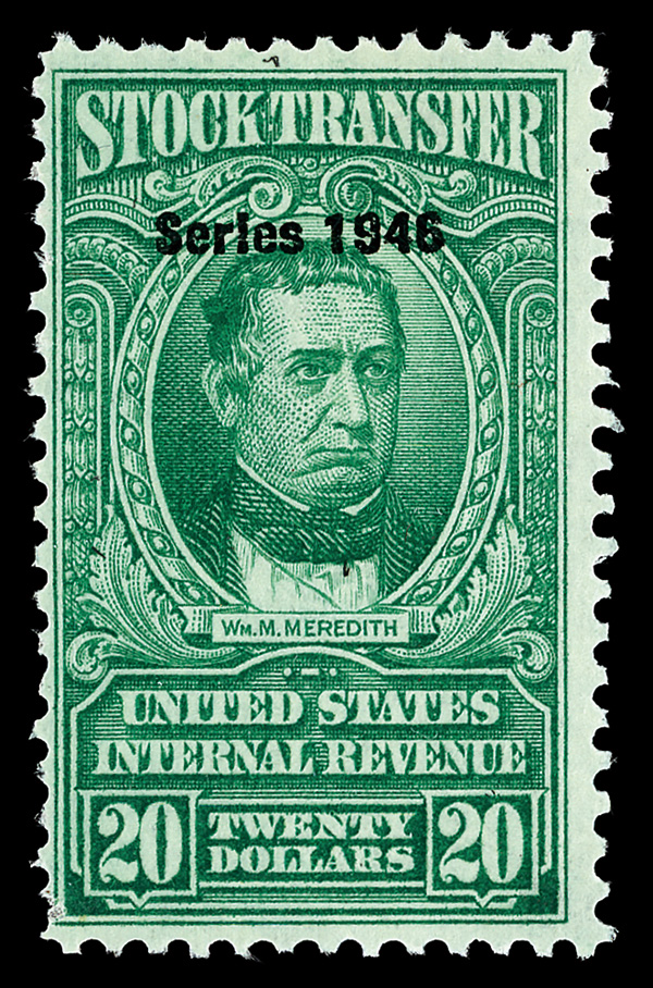 8414 og RD225 imageStock Transfer, 1946, $20 Meredith (Scott RD225), o.g., lightly hinged at top center, deep dark color on bright white paper, fresh and Fine, 8 mint examples have appeared on Stamp Auction Network, and it has been reported that only 9 mint examples have been recorded, ex Sage.