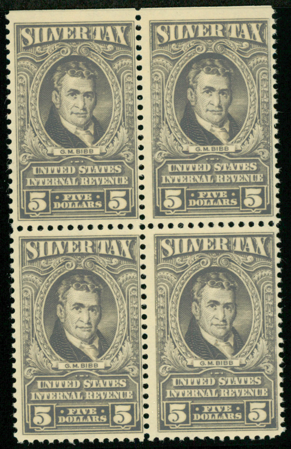 8426 nhbl RG124 imageSilver Tax, 1944, $5 gray (Scott RG124), top margin straight edge block of 4, o.g., never hinged, Fine.