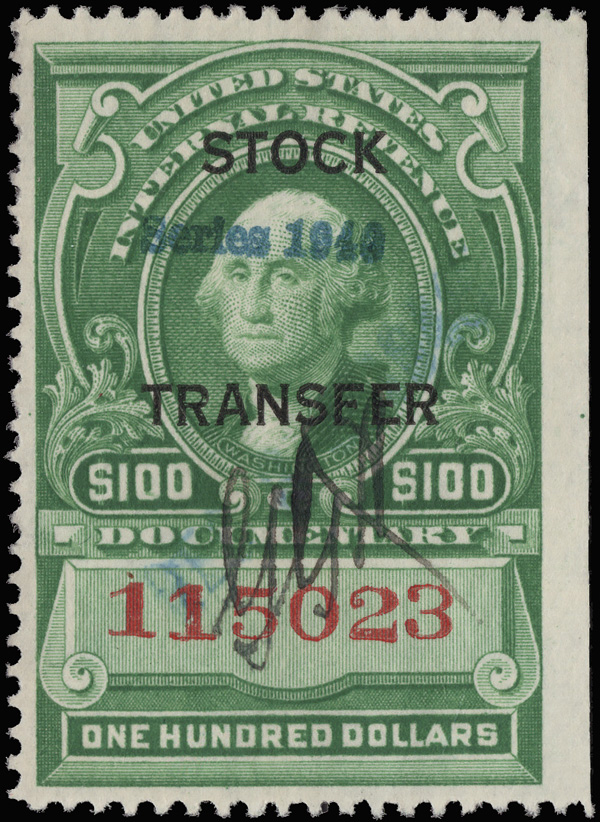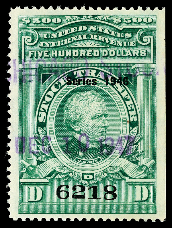 8415 O RD230 imageStock Transfer, 1946, $500 Dix (Scott RD230), "Chicago Stock Dec. 10, 1947" (Clearing House) violet handstamped cancel, bright color and proof quality impression; light horizontal crease, still Extremely Fine.