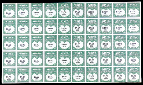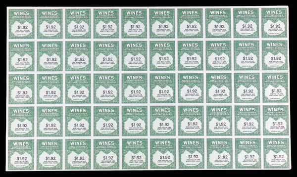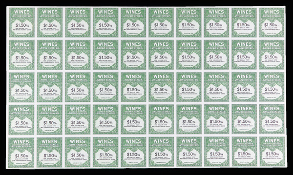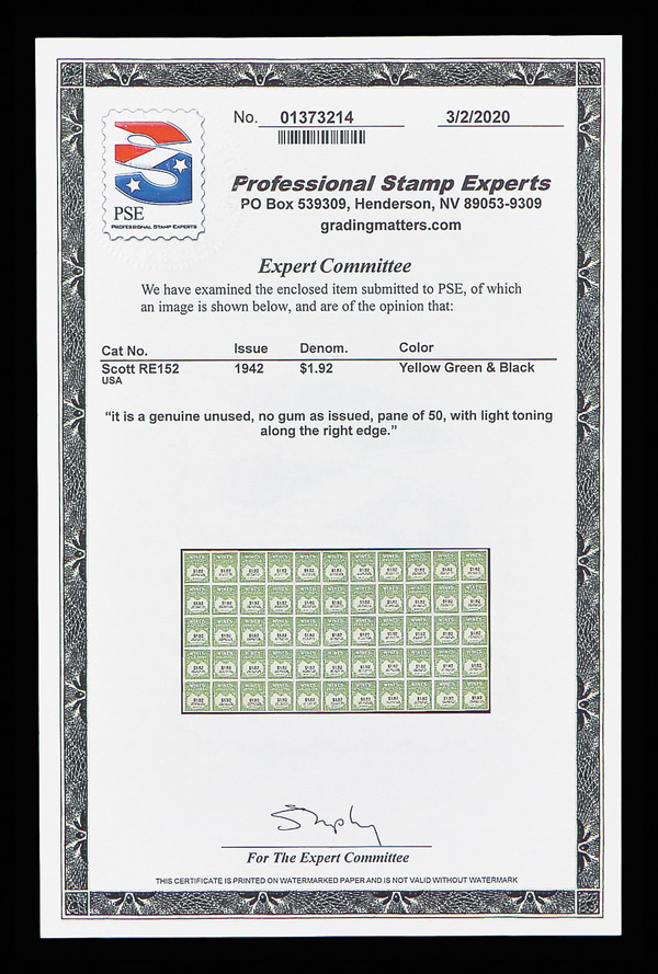 8422 ngbl RE152 imageWines, 1942, $1.92 yellow green & black (Scott RE152), full pane of 50, without gum as issued, well centered and in rich color; light toning along right edge, otherwise Very Fine, with 2020 P.S.E. certificate.