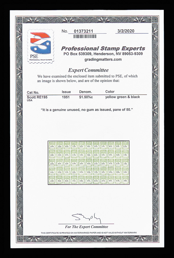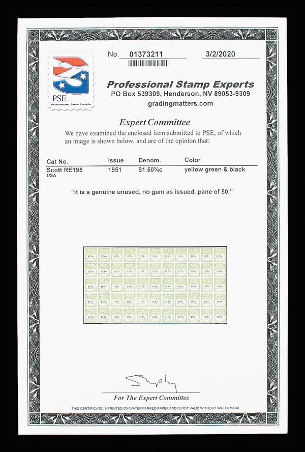 8424 ngbl RE195 imageWines, 1951, $1.503/4¢ yellow green & black (Scott RE195), full pane of 50, without gum as issued, fresh with clean impression, Fine to Very Fine, with 2020 P.S.E. certificate.