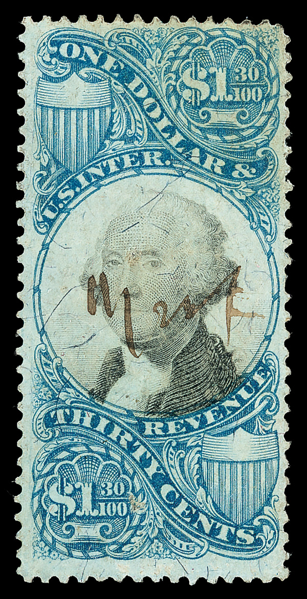 8409 O R119 imageDocumentary, 1871, Second Issue, $1.30 blue & black (Scott R119), manuscript cancel at center, sharp impression; corner crease at top right and faint soiling at top edge, Fine to Very Fine appearance.