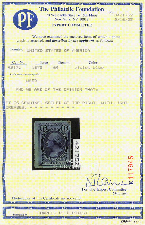 8411 O RB17c imageProprietary, 1875, 6¢ violet blue, rouletted (Scott RB17c), very faint cancel; soiled at top right and light creases, Fine appearance, with 2005 P.F. certificate.