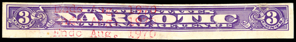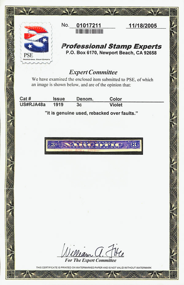 8428 O RJA48a imageNarcotic Tax, 1919, 3¢ violet, imperf (Scott RJA48a), bright color; rebacked over faults, lovely Fine appearance and very scarce in used condition, with 2005 P.S.E. certificate.
