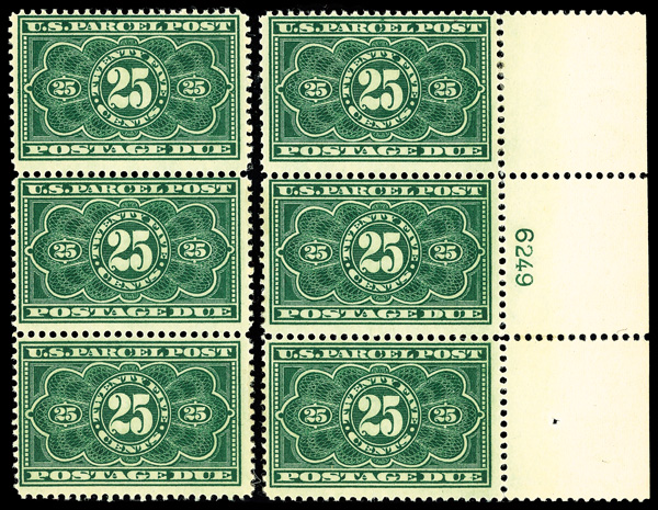 8401 nhbl JQ5 imageParcel Post Postage Due, 1913, 25¢ dark green (Scott JQ5), right margin plate block of 6 with plate number 6249, Lovely inexpensive example of this rare plate block, o.g., never hinged; separated vertically between stamps, Fine.