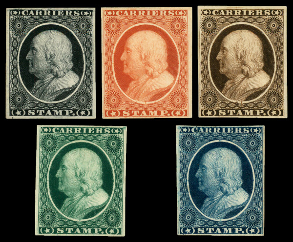 8405 P LO1TC4a-LO1TC4e imageCarrier, 1851 (1¢) Franklin, "Atlanta" trial color plate proofs on card, complete (Scott LO1TC4a-LO1TC4e), set of 5, o.g., never hinged, Very Fine.