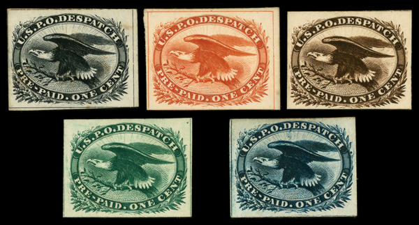 8406 P LO2TC4a-LO2TC4e imageCarrier, 1851, 1¢ Eagle, "Atlanta" trial color plate proofs on card, complete (Scott LO2TC4a-LO2TC4e), set of 5, o.g., never hinged, Very Fine.