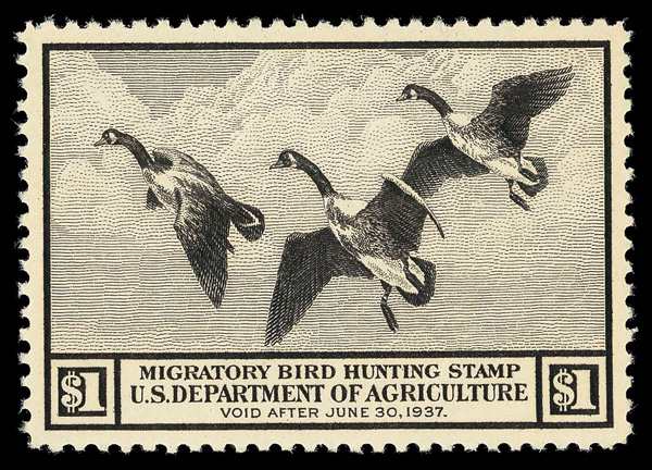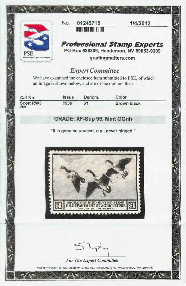8433 nh RW3 imageFederal Duck Stamp, 1936, $1 Canada Geese (Scott RW3), o.g., never hinged, Extremely Fine to Superb, with 2012 P.S.E. certificate graded XF-SUP 95.