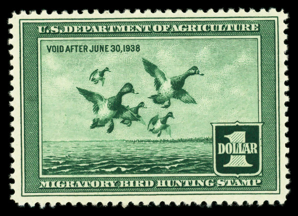 8434 nh RW4 imageFederal Duck Stamp, 1937, $1 Scaup Ducks (Scott RW4), o.g., never hinged, Extremely Fine.