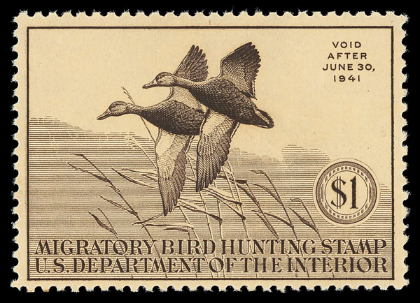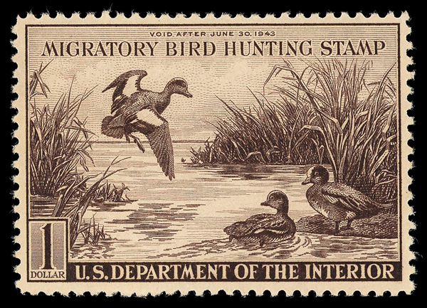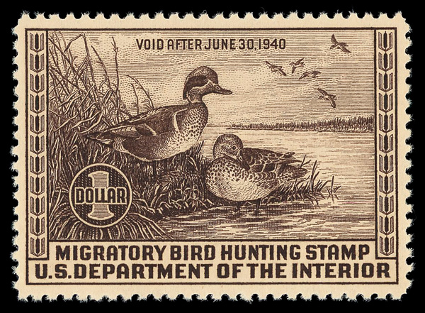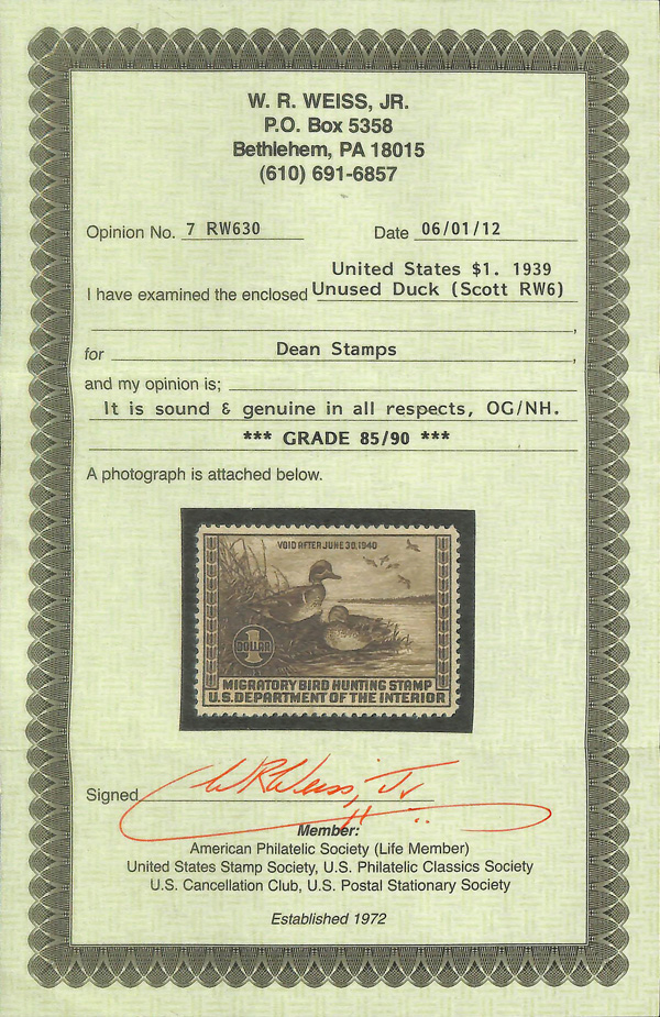 8435 nh RW6 imageFederal Duck Stamp, 1939, $1 Green-winged Teals (Scott RW6), o.g., never hinged (gum bends), Very Fine to Extremely Fine, with 2012 Weiss certificate graded VF-XF 85/90.
