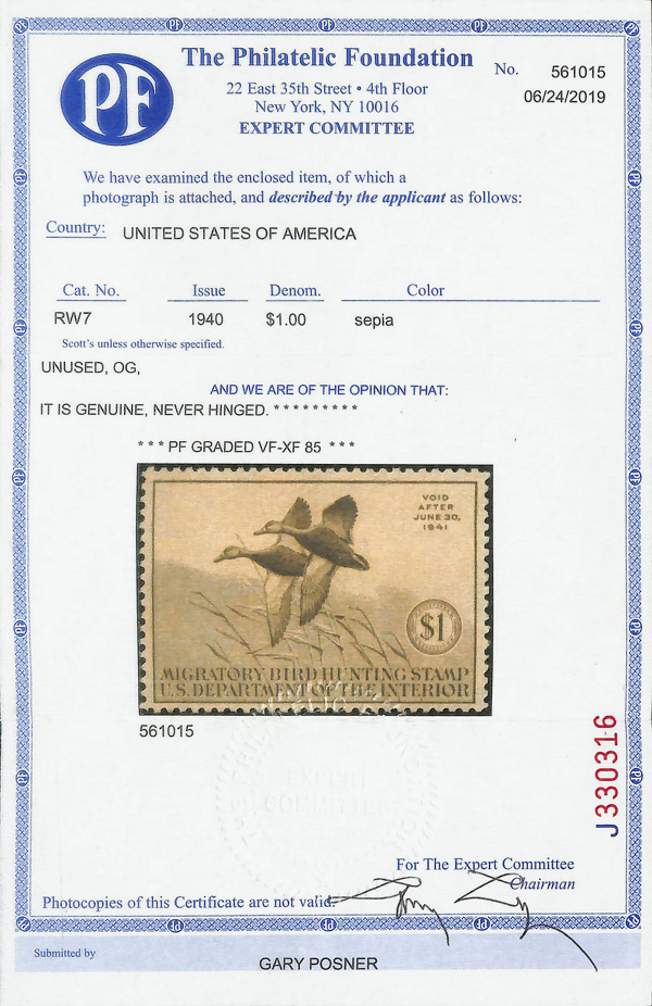 8436 nh RW7 imageFederal Duck Stamp, 1940, $1 Black Mallards (Scott RW7), o.g., never hinged, Very Fine to Extremely Fine, with 2019 P.F. certificate graded VF-XF 85.
