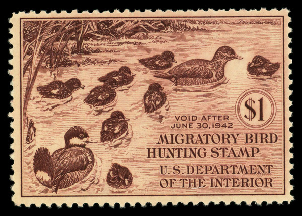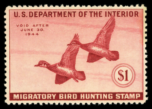 8439 nh RW10 imageFederal Duck Stamp, 1943, $1 Wood Ducks (Scott RW10), o.g., never hinged, Very Fine.