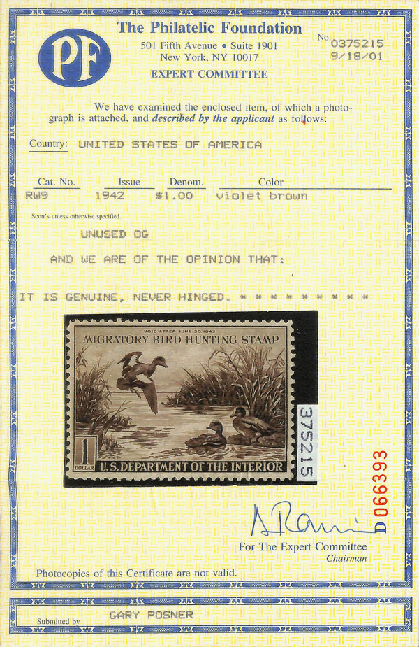 8438 nh RW9 imageFederal Duck Stamp, 1942, $1 Baldpates (Scott RW9), o.g., never hinged, Very Fine, with 2001 P.F. certificate.