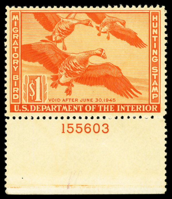 8440 nh RW11 imageFederal Duck Stamp, 1944, $1 White-fronted Geese (Scott RW11), plate number single, o.g., never hinged (gum skip), Very Fine.