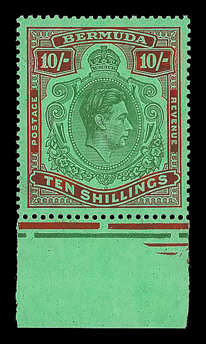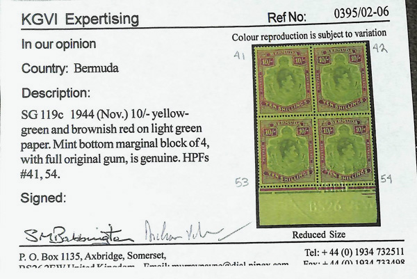 8647 nh 126b image1943, King George VI, 10s yellowish green & deep carmine red on green, perf. 14 (Scott 126b), o.g., never hinged, Extremely Fine, with photocopy of 2006 KGVI Expertising certificate for block.