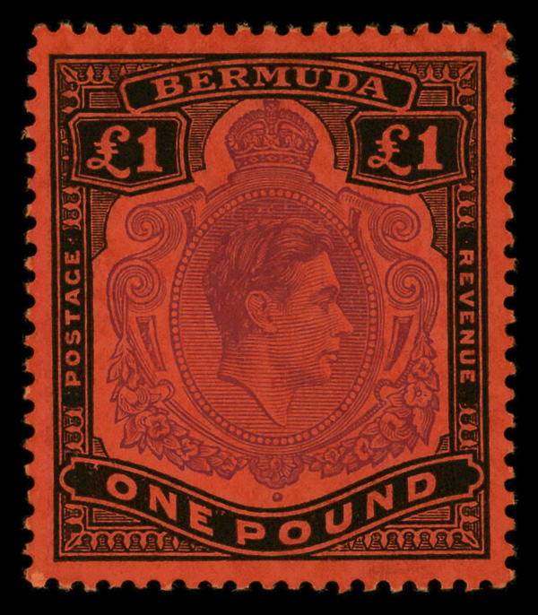 8649 nh 128 var. image1952, King George VI, £1 violet & black on scarlet, perf. 13 (Scott 128 var.), o.g., never hinged, Extremely Fine.