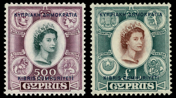 8659 og 196-197 image1960, Republic overprint on Queen Elizabeth II Pictorial, 500m & £1, high values (Scott 196-197), o.g., lightly hinged, Fine to Very Fine.