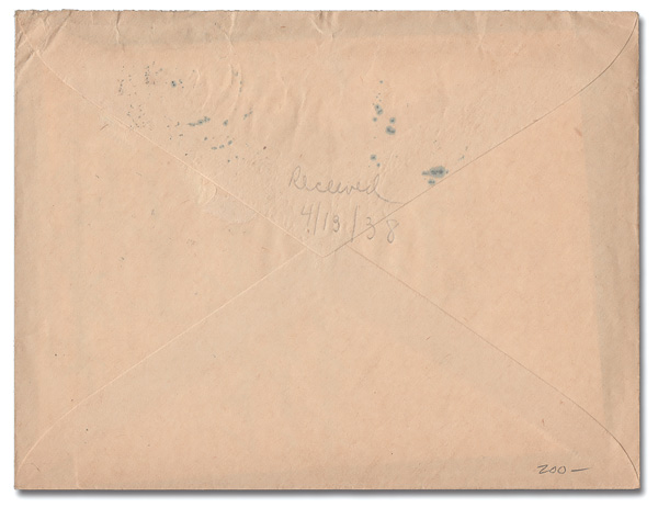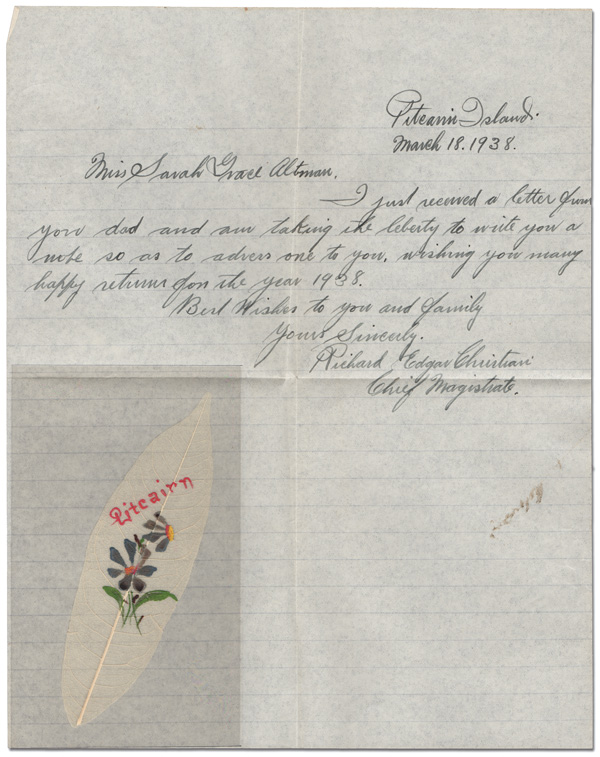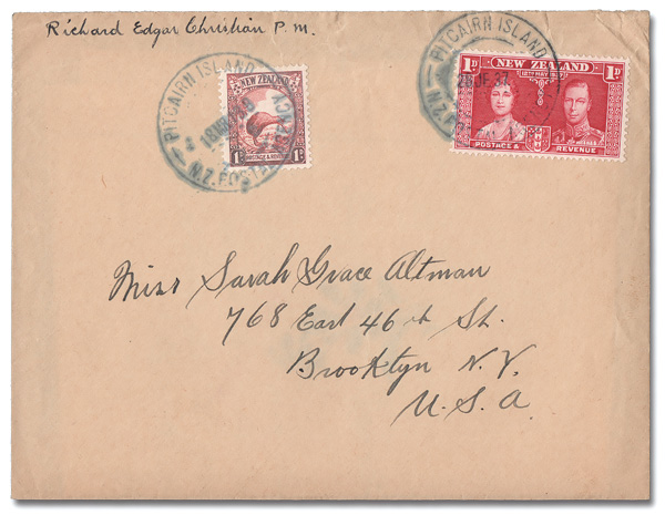 8697 cover 1938.0318 image1938, Cover & Letter from Postmaster/Chief Magistrate, Richard Edgar Christian, an ANS to Miss Sarah Grace Altman, Brooklyn, N.Y., enclosing a hand-decorated leaf painted by Irma Christian; the cover is franked with a New Zealand 1d Kiwi canceled Pitcairn on 18 Mar 1938 and also with a 1d Coronation previously canceled Pitcairn on 23 Jun 1937 (perhaps Christian kept several of these envelopes on hand to send as souvenirs)., Very Fine. (Image) (Image2) (Image3) (All Images)