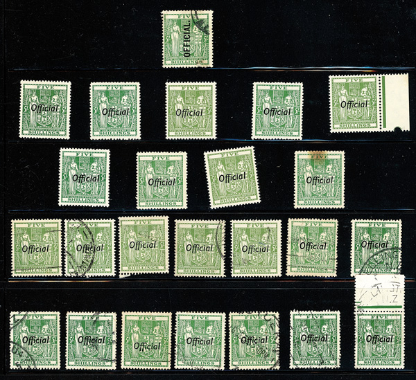 8692 official 1933-38 imageNew Zealand, Mint & Used Holding of the 5s Official Overprint, 1933-38, Multiples of the 5-shilling stamp from the Coat of Arms postal-fiscals with "official" overprint; one with vertical overprint (#O57, pulled perf), and 34 horizontal examples of what appears to be O75, nine of which are mint, overall Fine to Very Fine, fully viewable online. (Image) (Image2) (All Images)