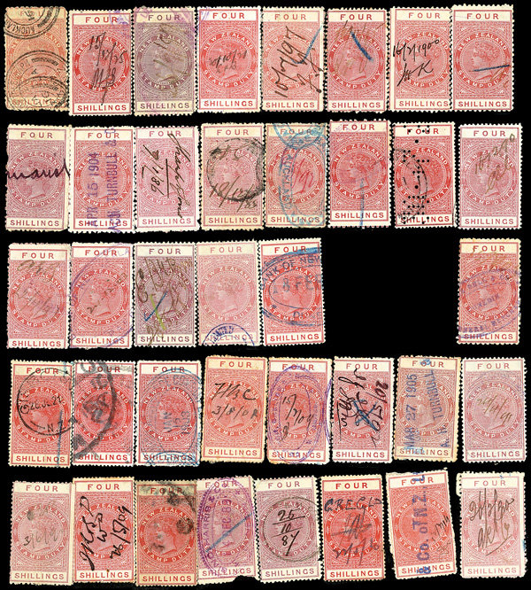 8693 1867-1940s imageNew Zealand, Holding on Revenues on Piece or Document, 1867-1940s, Four documents and approximately 80 pieces with one or more revenues, some with postage stamps used fiscally, such as #98 tied with £8 QV Stamp Duty (Mowbray R479), among others including postal-fiscals, mortgage indemnity fees, counterparts, and more, overall Fine to Very Fine, fully viewable online. Shipping charges apply - weight 0.6 lbs. (PDF for this Lot) (Image) Suggested Bid $120