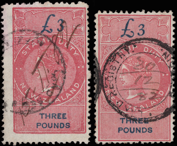 8696 O R357, R357a image1867, Queen Victoria, die II, perf'd, £3 rose & blue (Kiwi R357, R357a), normal and long tail "£", both with circular handstamp and manuscript date; blind perfs and small nick at the left, Fine to Very Fine(all perfs intact).