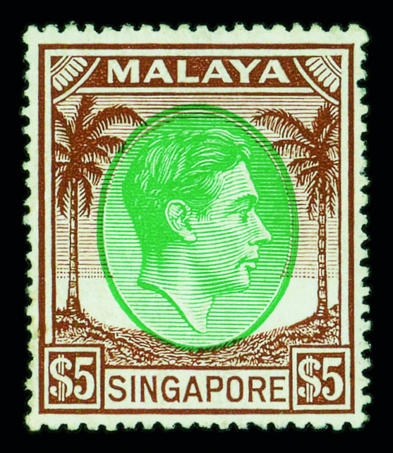 8698 og 20a image1951, King George VI, $5 green & brown, perf 18 (Scott 20a), single, o.g., lightly hinged, Fine to Very Fine.