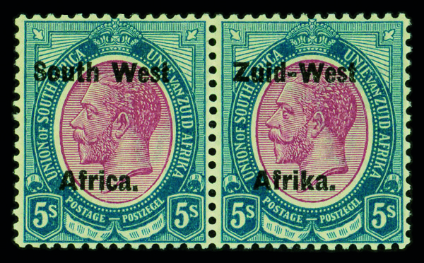 8702 og 13 image1923, Setting II overprint on South Africa KGV 5s purple & blue (Scott 13), se-tenant pair, o.g., invisibly hinged, Very Fine, se-tenant pairs.