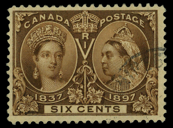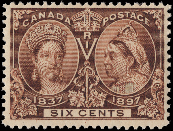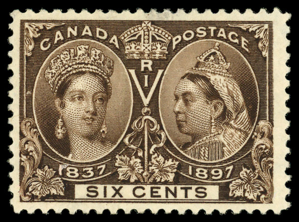 8790 og 55 image1897, Queen Victoria Jubilee, 6¢ yellow brown (Scott 55), o.g., barest trace of hinge, Fine to Very Fine.