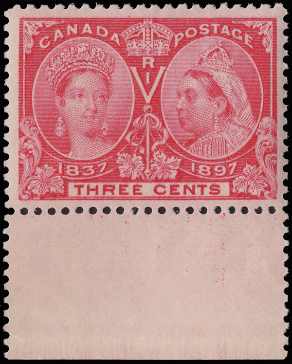 8786 nh 53 image1897, Queen Victoria Jubilee, 3¢ bright rose (Scott 53), an incredible bottom sheet margin single, o.g., never hinged, bright, fresh and beautifully centered, Very Fine to Extremely Fine.
