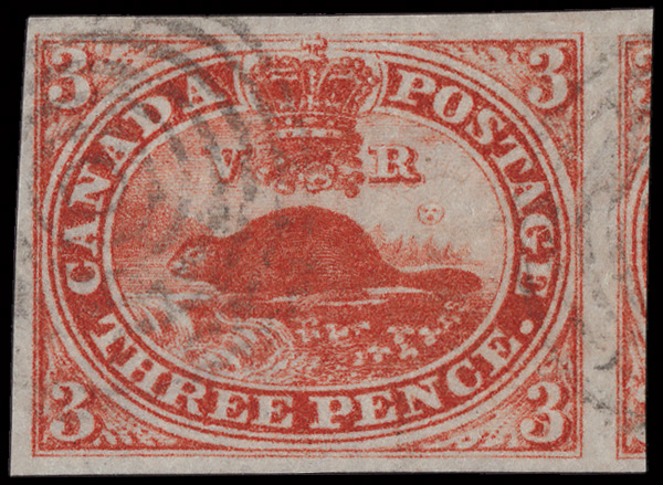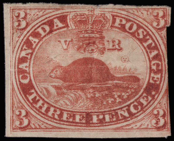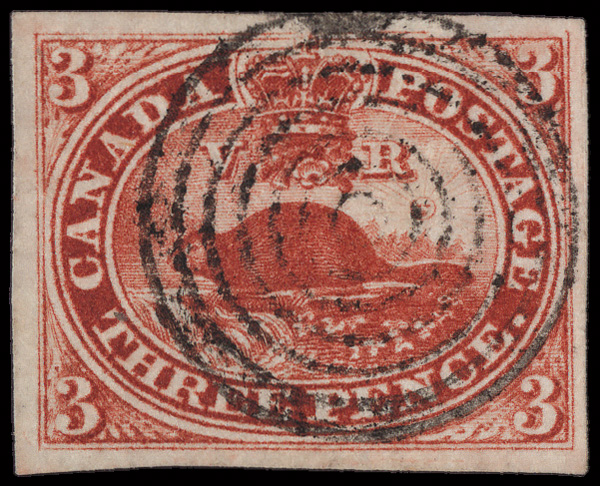 8765 O 4a image1853, Beaver, 3d brown red, on wove paper, imperforate (Scott 4a), exceptionally fresh with beautifully balanced margins and a neat target cancel, Very Fine.