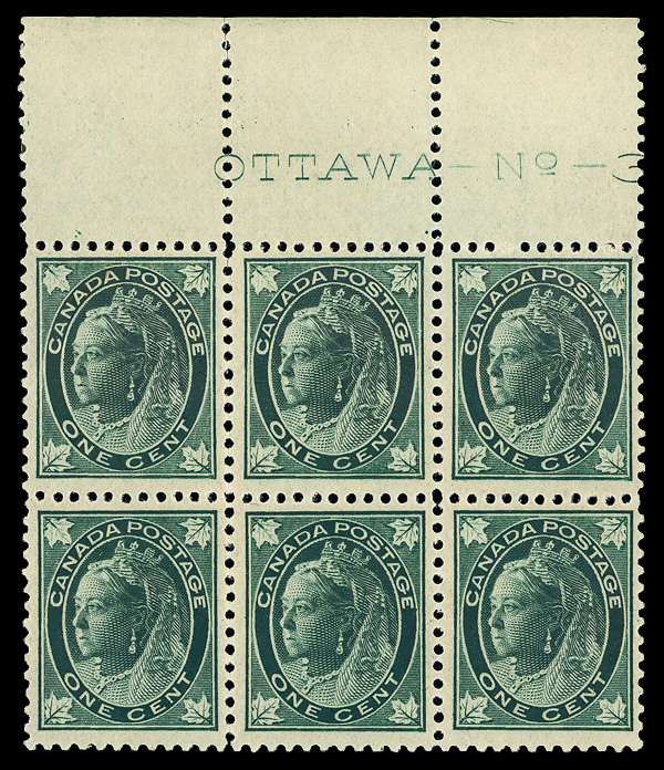 8800 nhbl 67 image1897, Queen Victoria "Maple Leaf", 1¢ blue green (Scott 67), plate block of 6, o.g., never hinged, Fine to Very Fine.
