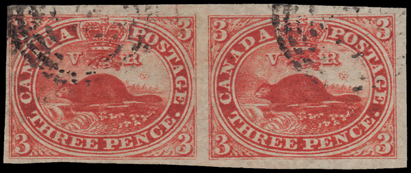 8766 O 4d image1852, Beaver, 3d orange red, on thin wove paper, imperforate (Scott 4d), an attractive, lightly canceled horizontal pair with stunning color and large margins except a bit close at the left, Very Fine.