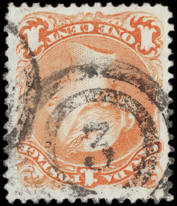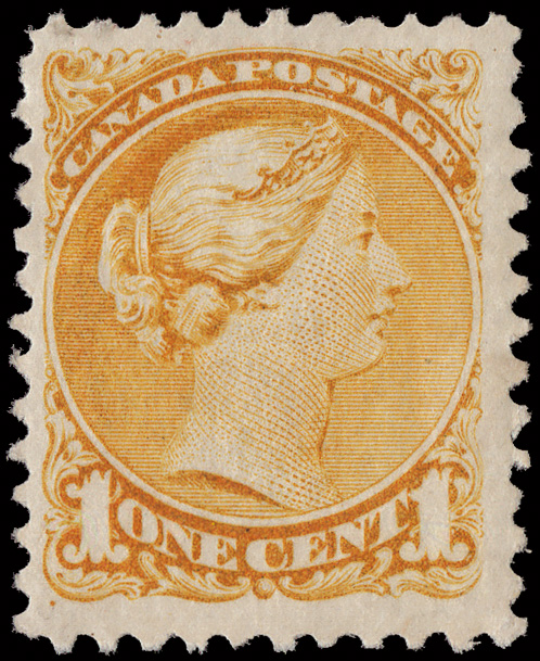 8773 O 23 image1868, Large Queen, 1¢ yellow orange (Scott 23), beautifully centered with exceptional color and a neat (inverted) Ottawa "3" 2-ring cancel, Very Fine to Extremely Fine.