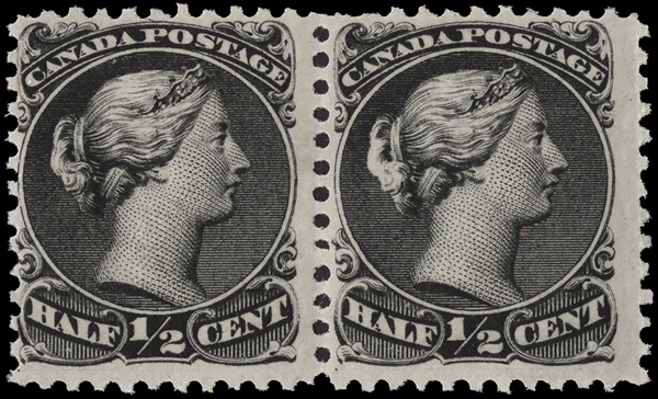 8772 nh 21 vars. image1868, Large Queen, ½¢ black, two plate flaws se-tenant (Scott 21 vars.), a bright, fresh horizontal pair, line above "POSTAGE" and spur in scroll left of "H", o.g., never hinged, Fine and most unusual.