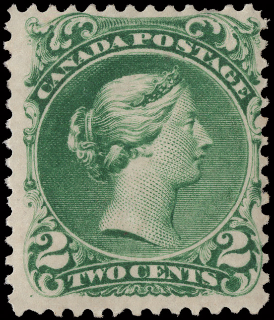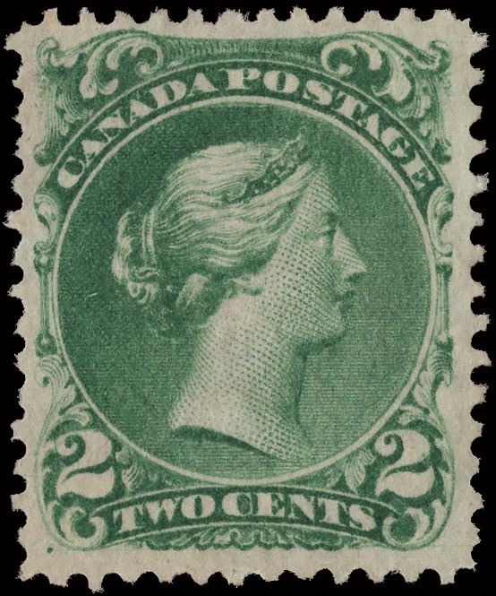 8774 og 24 image1868, Large Queen, 2¢ green (Scott 24), o.g., exceptionally bright and fresh; single missing perf at the upper right, otherwise Fine.