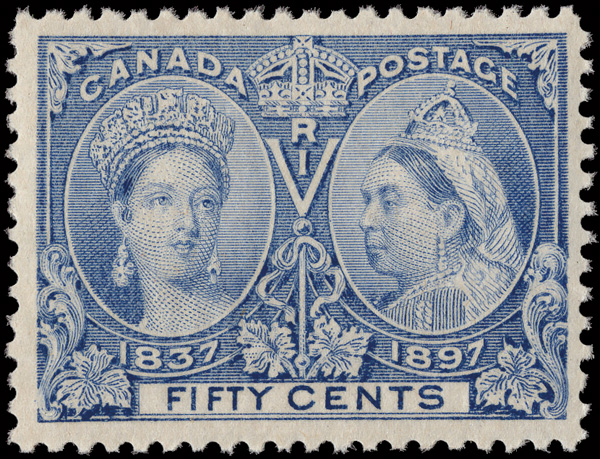 8796 og 60 image1897, Queen Victoria Jubilee, 50¢ ultramarine (Scott 60), a marvelous right sheet margin single, o.g., very lightly hinged, fresh and virtually perfectly centered with gorgeous color, Extremely Fine to Superb.