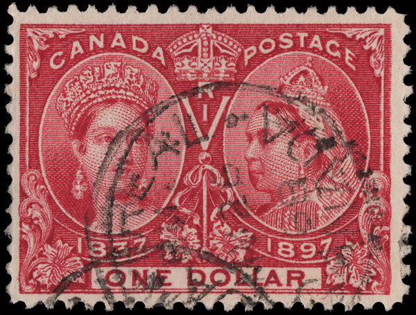 8797 O 61 image1897, Queen Victoria Jubilee, $1 lake (Scott 61), canceled with a Montreal c.d.s., fresh and Fine.