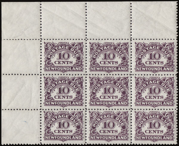 8761 nhbl J7, J7 var. imagePostage Due, 1949, 10¢ dark violet, watermarked, "LUE" for "DUE" (Scott J7, J7 var.), the lower right stamp in an upper left corner sheet margin block of 9, o.g., never hinged, Very Fine.