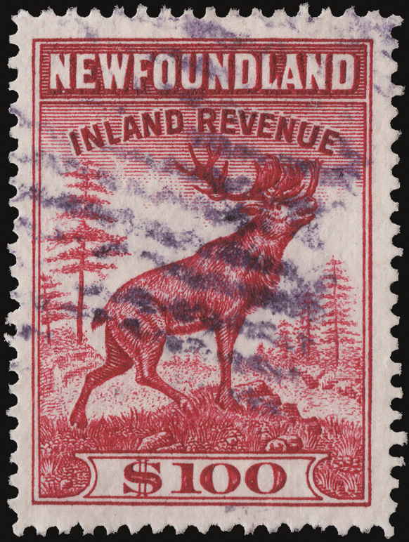 8762 O NFR35 imageInternal Revenue, 1938 Caribou, $100 claret (Van Dam NFR35), fresh and well centered, Very Fine. Very Rare!