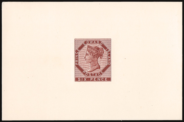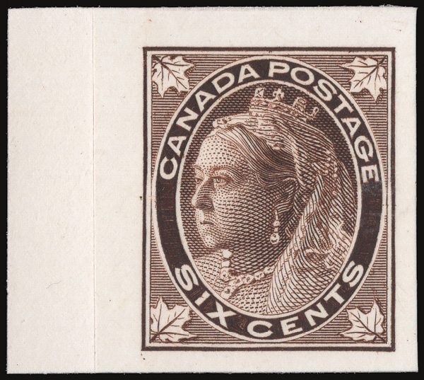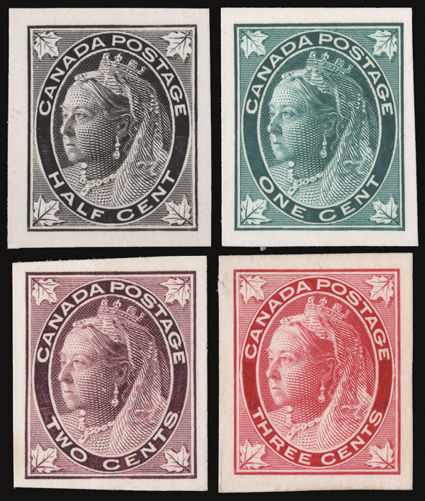 8798 P 66-69, 71 vars. image1897-98, Queen Victoria "Maple Leaf" issue, ½¢-3¢ & 6¢, plate proofs, India on card (Scott 66-69, 71 vars.), bright colors and large margins, the 6¢ with upper left corner sheet margin, Very Fine to Extremely Fine.