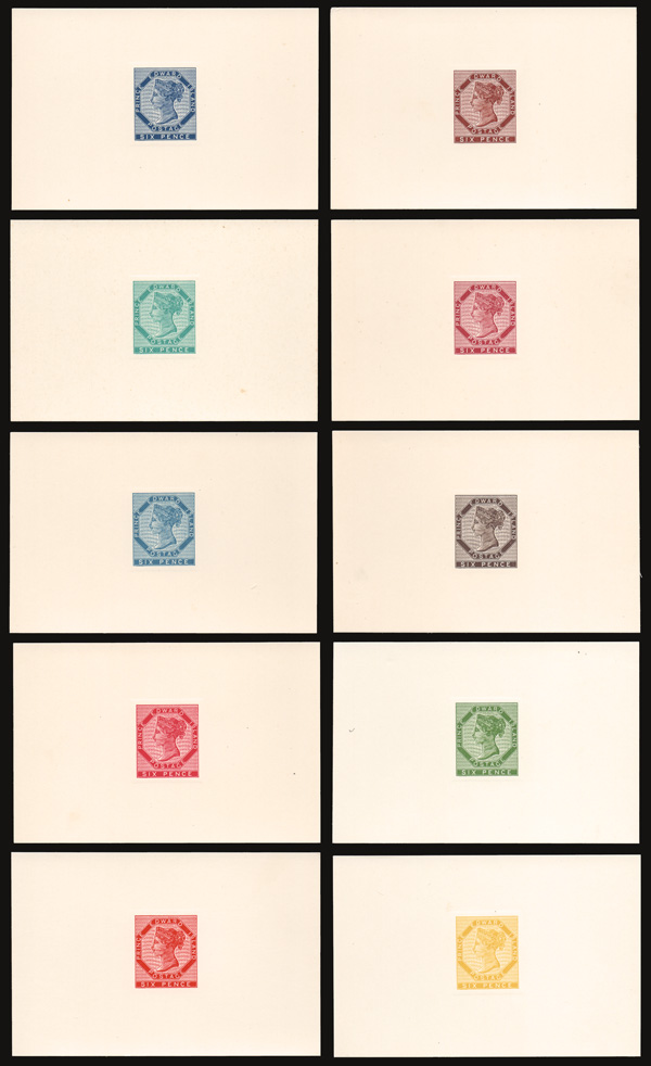 8764 og 7 var. image1862-68, 6d Reprint Die Proofs on cream card (Scott 7 var.), complete set of 10 different colors, Extremely Fine. (Image) (Image2) (All Images)