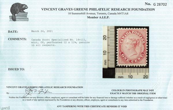 8769 og 14 var. image1859, Queen Victoria, 1¢ rose, perf. 12x11¾ (Scott 14 var.), o.g., exceptionally bright and fresh, Fine to Very Fine, with a 2021 Greene Foundation certificate.
