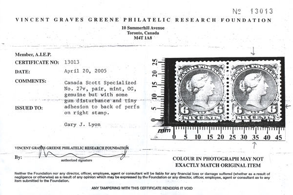 8776 og 27 var. image1868, Large Queen, 6¢ dark brown (Scott 27 var.), slightly disturbed o.g., rich color, centered low with "tiny adhesion to back of perfs," (noted on the accompanying certificate), Very Good to Fine, with a photocopy of a 2005 Greene Foundation certificate for a pair.