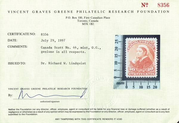 8781 og 46 image1893, Queen Victoria "Widow's Weeds", 20¢ vermilion (Scott 46), bright, fresh and beautifully centered, Very Fine to Extremely Fine, with a 1997 Greene Foundation certificate.