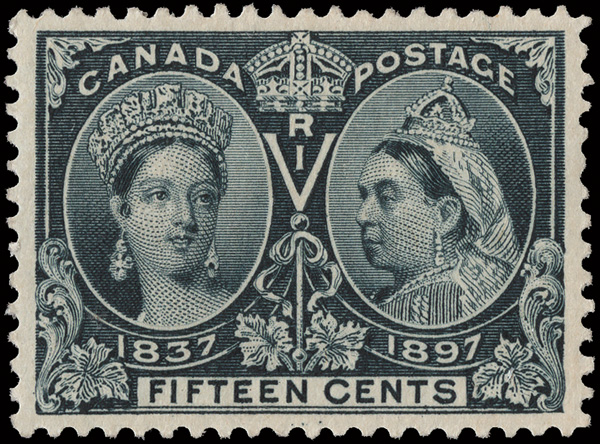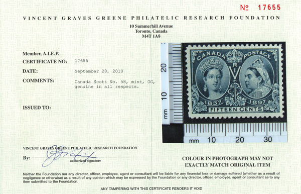 8794 og 58 image1897, Queen Victoria Jubilee, 15¢ steel blue (Scott 58), a gorgeous mint single, o.g., lightly hinged, wonderfully fresh and virtually perfectly centered, Extremely Fine to Superb, with a 2010 Greene Foundation certificate.