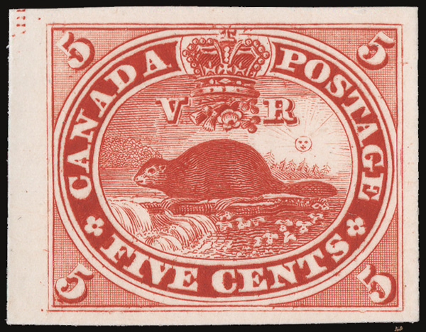 8770 P 15 var. image1859, Beaver, 5¢ vermilion, plate proof, India on card (Scott 15 var.), wonderfully bright and fresh with large margins, including a partial left sheet margin, Extremely Fine.