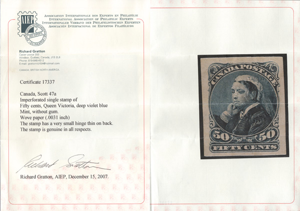 8783 ng 47a image1893, Queen Victoria "Widow's Weeds", 50¢ deep blue, imperf. (Scott 47a var.), a bright, fresh large-margined single, unused without gum; tiny thin speck, Very Fine to Extremely Fine appearance. Avery rare imperf only 100 pairs of the 20¢ & 50¢, combined, were issued, with a 2007 Gratton certificate.