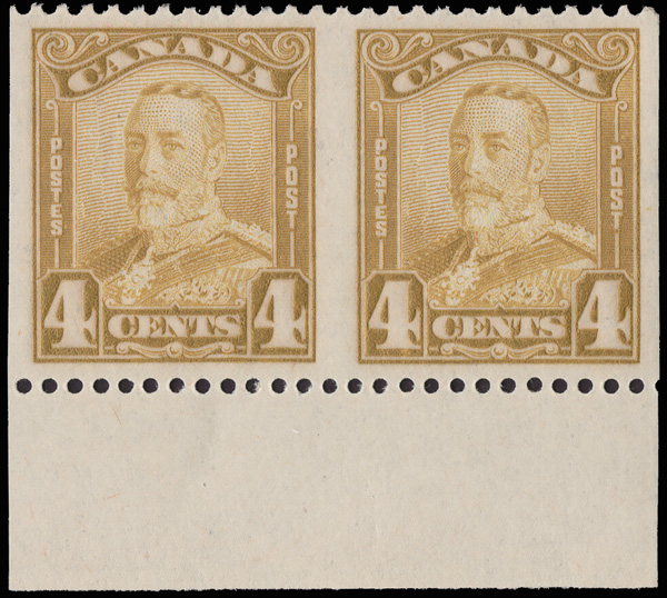 8883 nh 152b image1929, King George V "Scroll", 4¢ bister, horizontal pair, imperf vertically (Scott 152b), an exceptional bottom sheet margin pair, o.g., never hinged, fresh and beautifully centered, Extremely Fine to Superb. 250 pairs believed to exist, with a 2023 P.S.E. certificate graded XF-SUP 95.