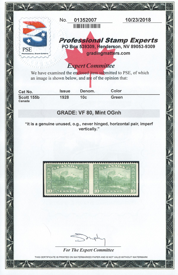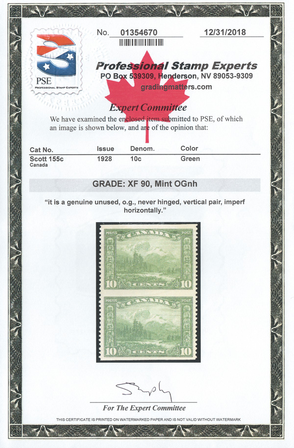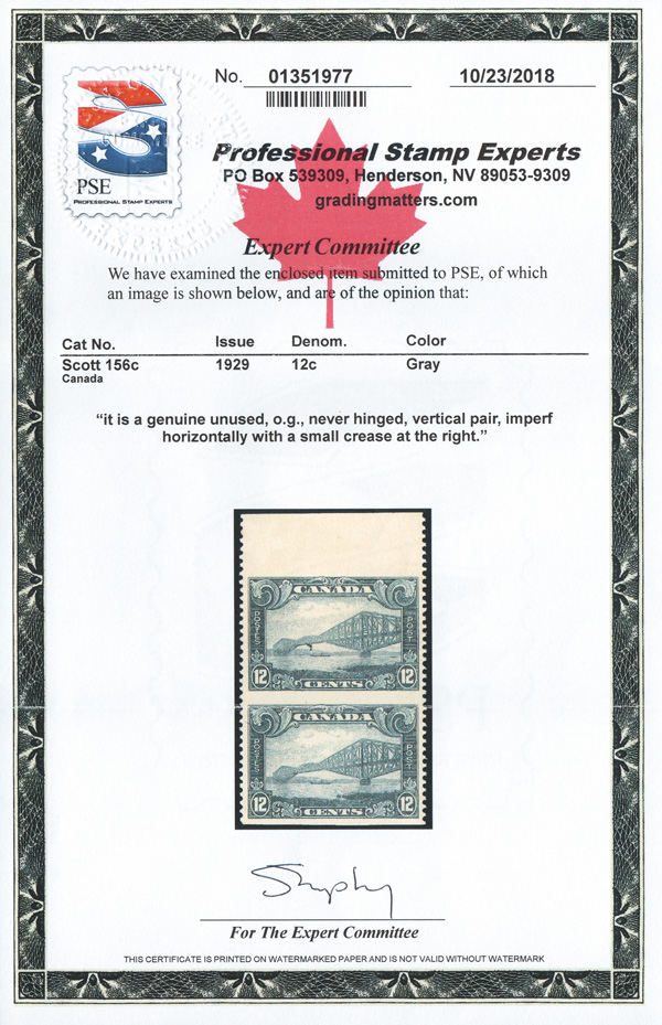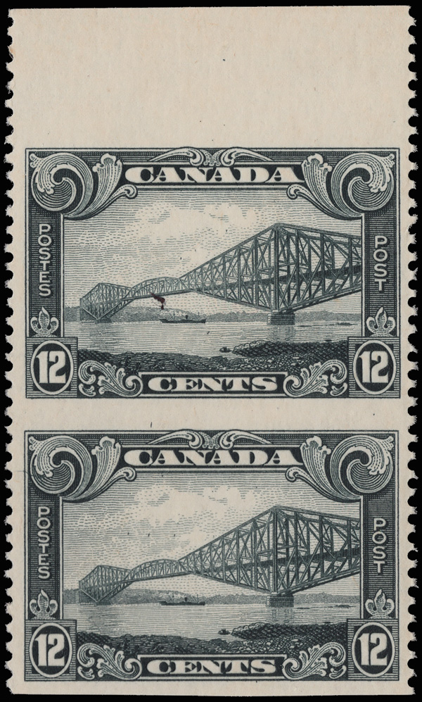 8890 nh 156c image1929, 12¢ Quebec Bridge, vertical pair, imperf horizontally (Scott 156c), top sheet margin pair, o.g., never hinged, fresh and beautifully centered; small, faint crease at the right edge, otherwise Very Fine. 250 pairs are believed to exist, with a 2018 P.S.E. certificate.
